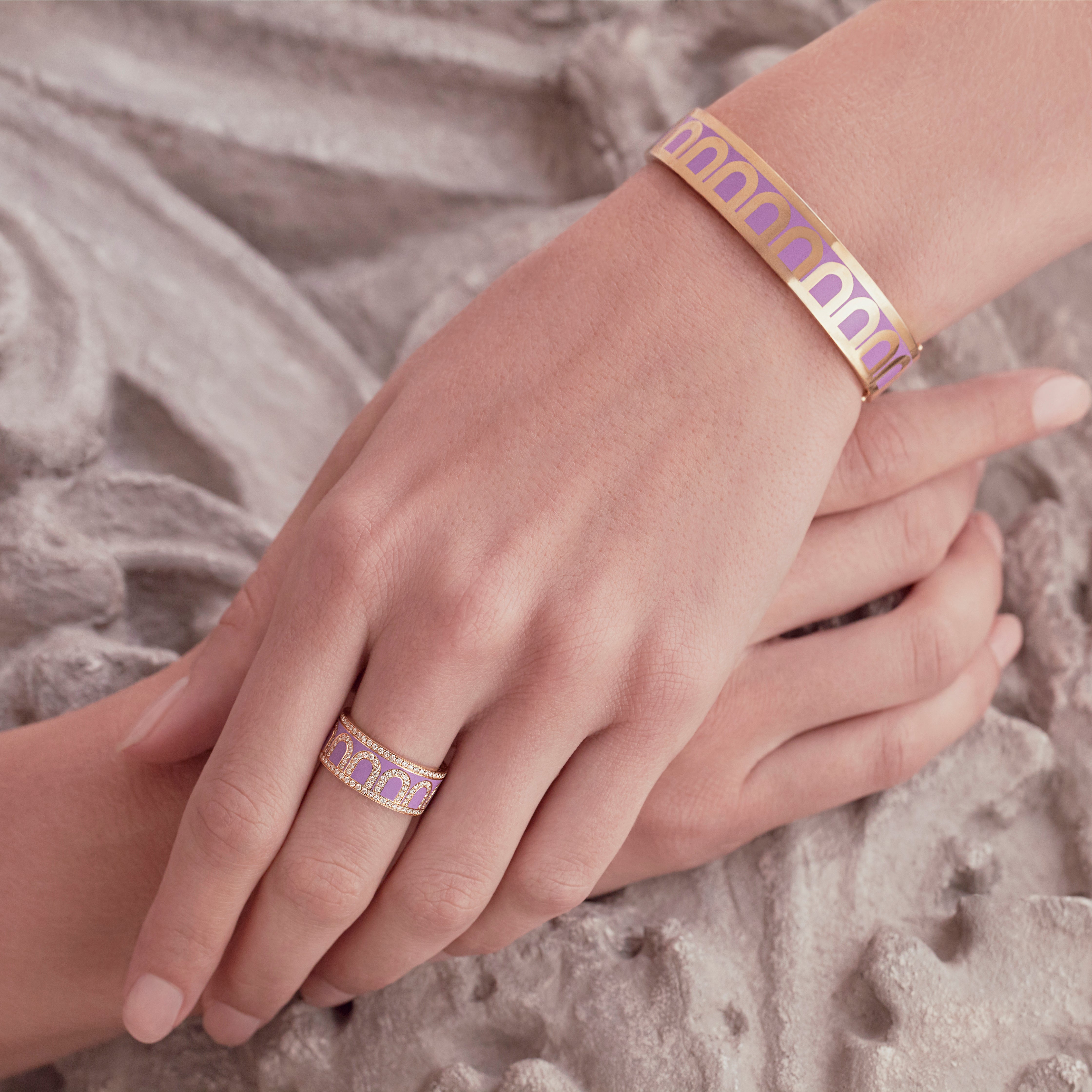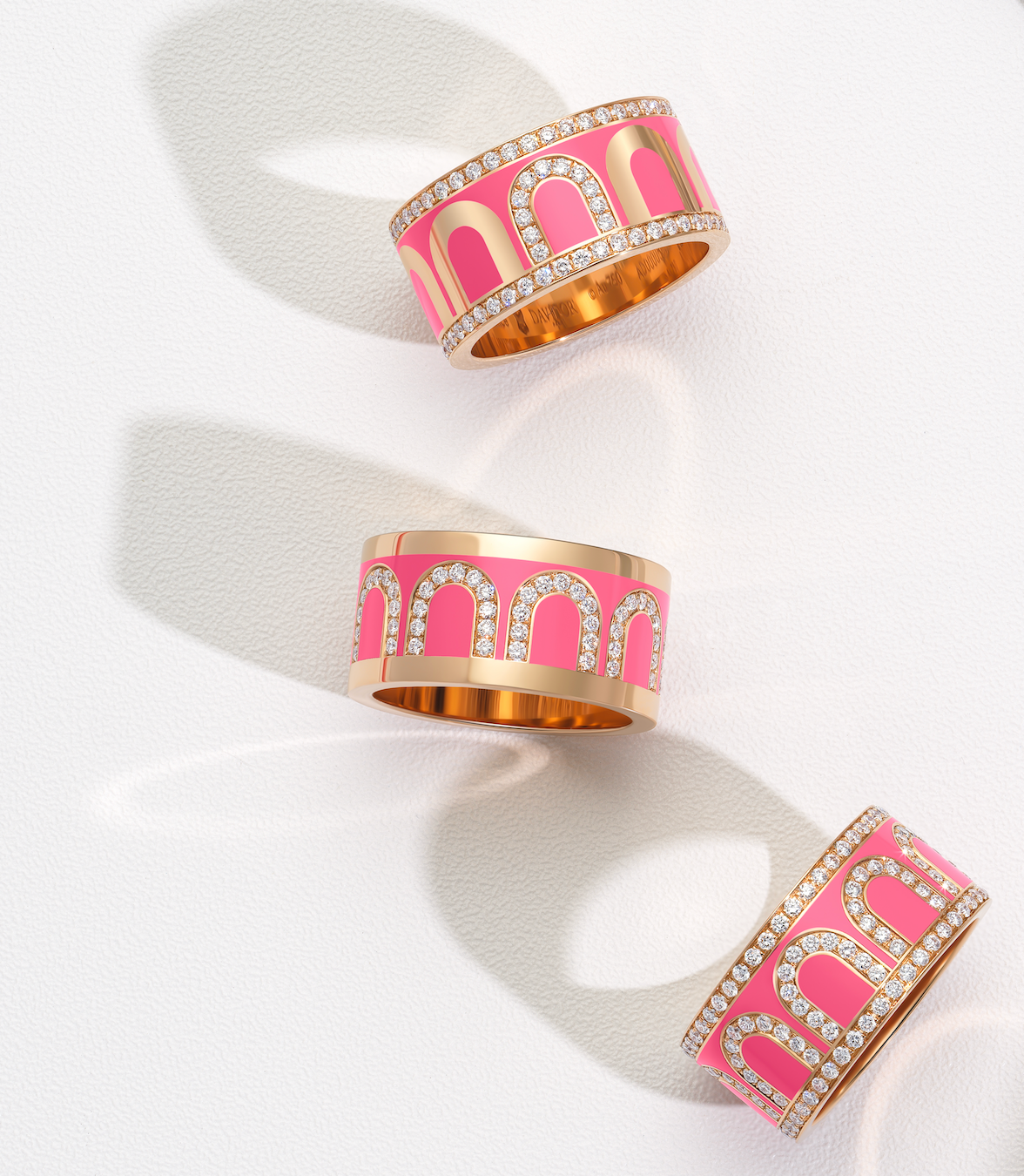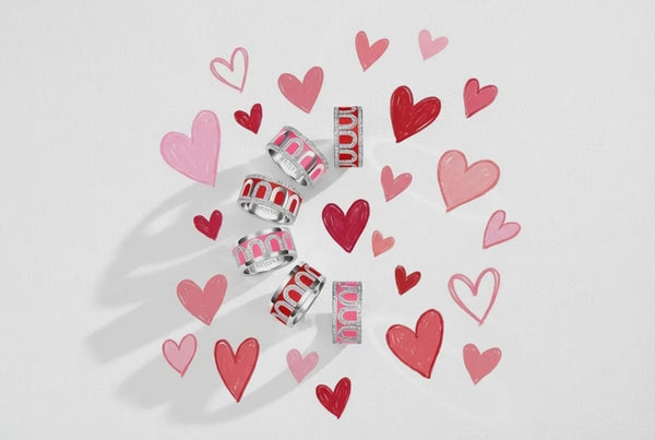 Six silver rings with pink and red enamel designs are arranged in the center, surrounded by hand-drawn pink and red hearts on a white background.