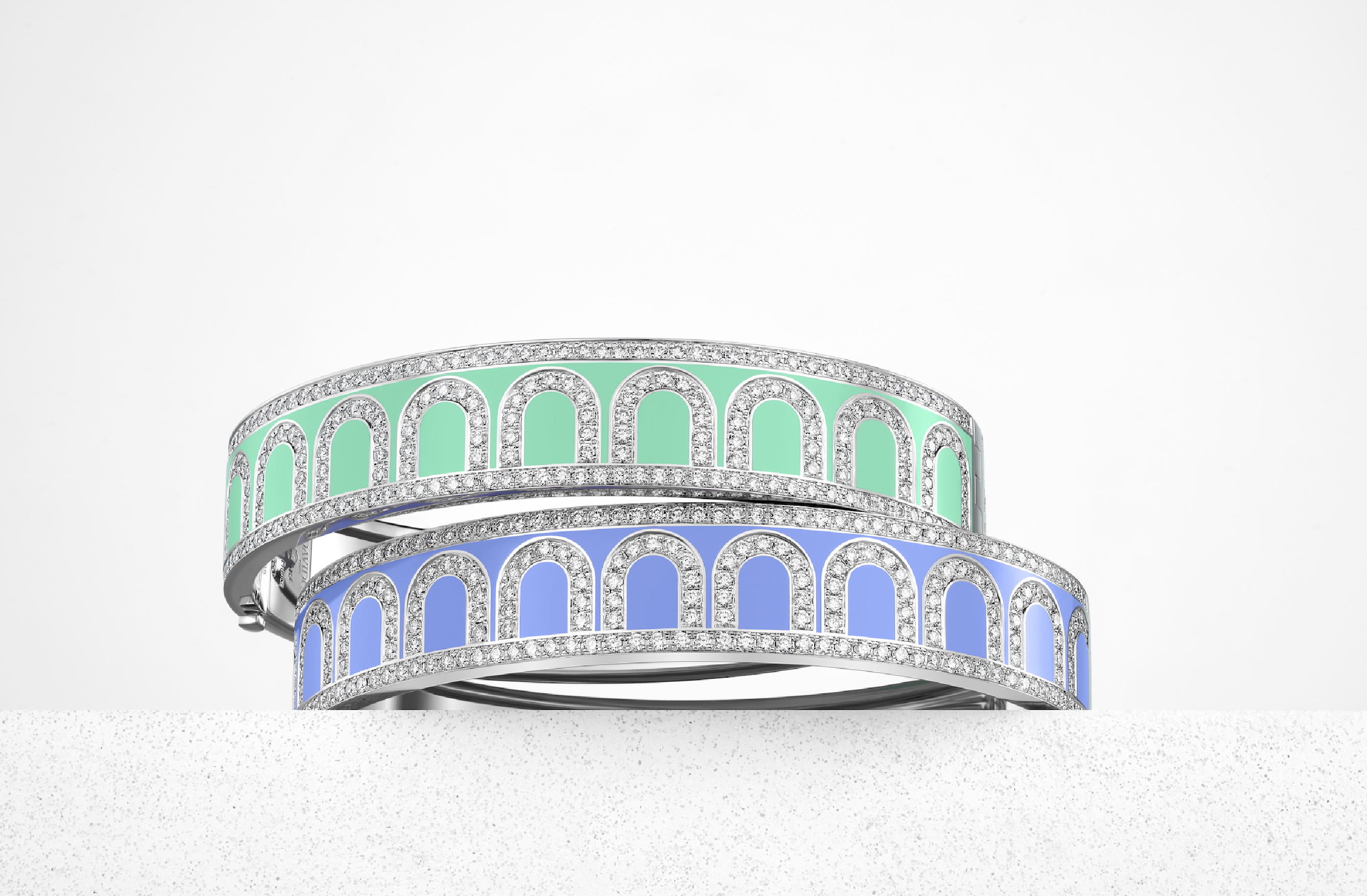 L'Arc Deco Bangle in Platinum with DAVIDOR Arch Cut Blue, Pink and Violet Sapphires and Brilliant Diamonds